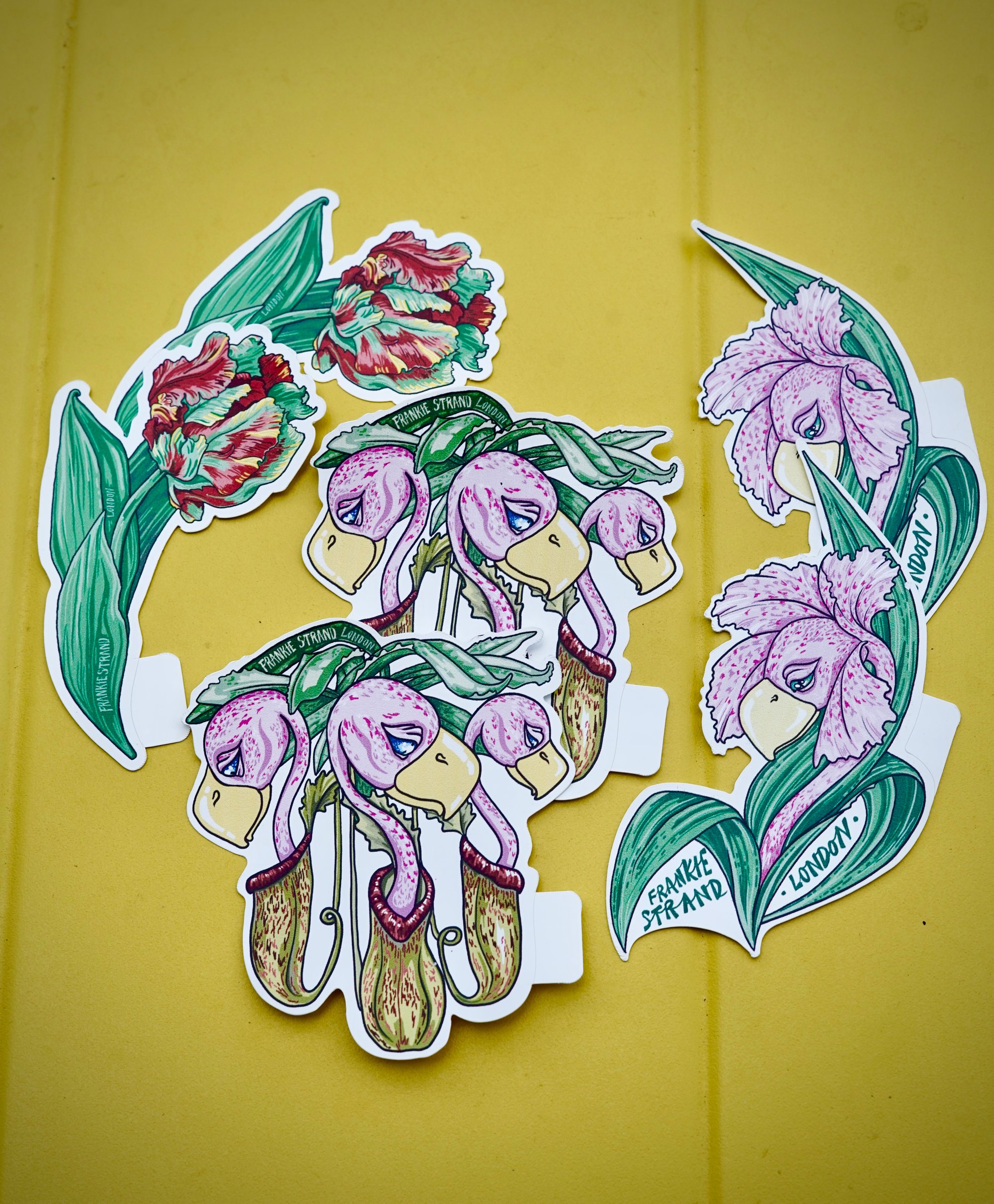 Sticker pack of 6 containing 2 of each design: Flamingo Tulip x 2 Flamingo Pitcher x 2 Parrot Tulip x 2